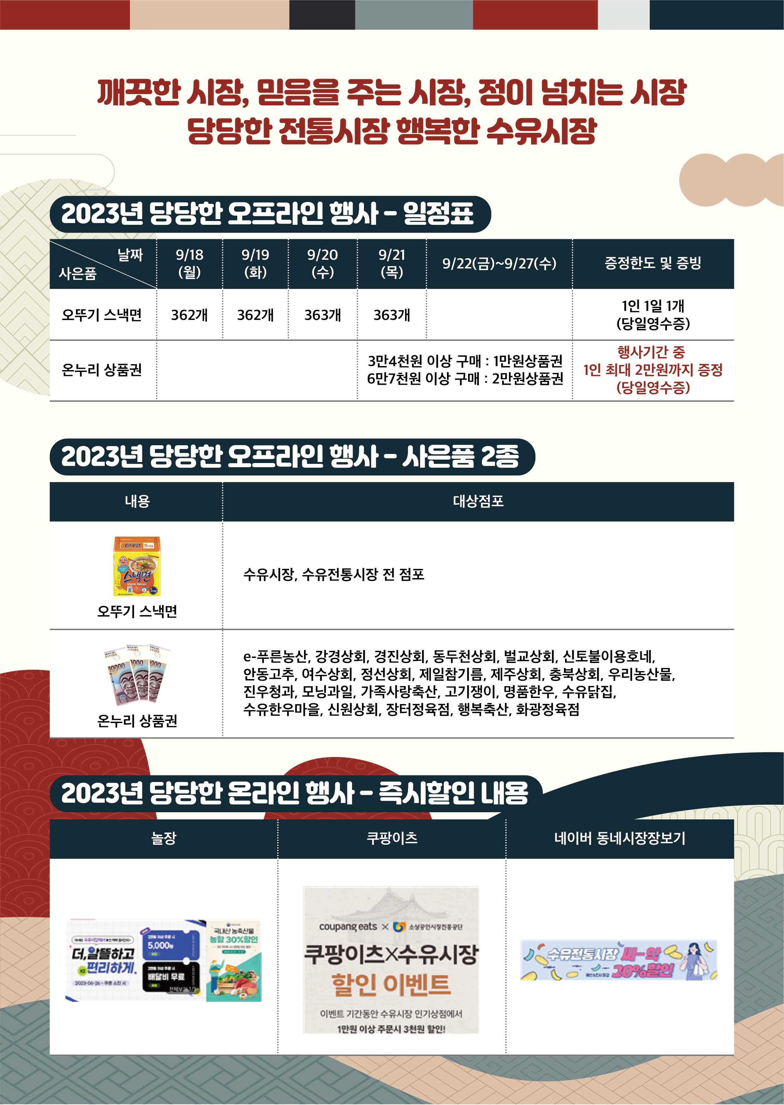 23년 추석을 맞이하여 수유시장에서 찾아주신 고객님께 감사하는 마음으로 풍성한 온.오프라인 추석행사를 준비했습니다.