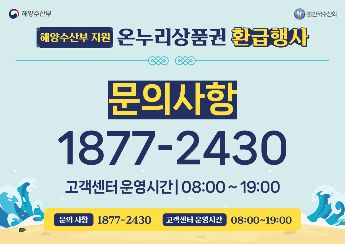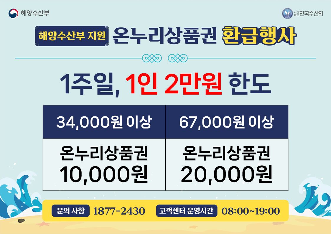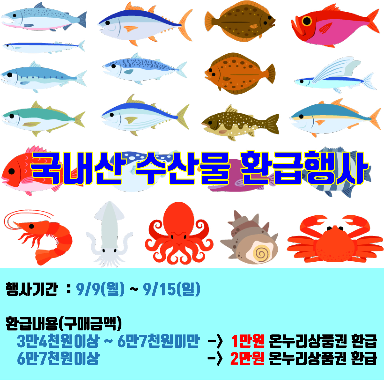 (사) 한국수산회에서는 수산물 물가안정과 지역경제 활성화를 위하여 해양수산부에서 주최하는 수산물 온누리 상품권환급행사를 진행합니다.