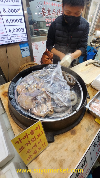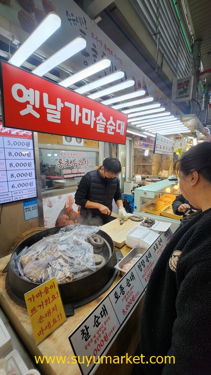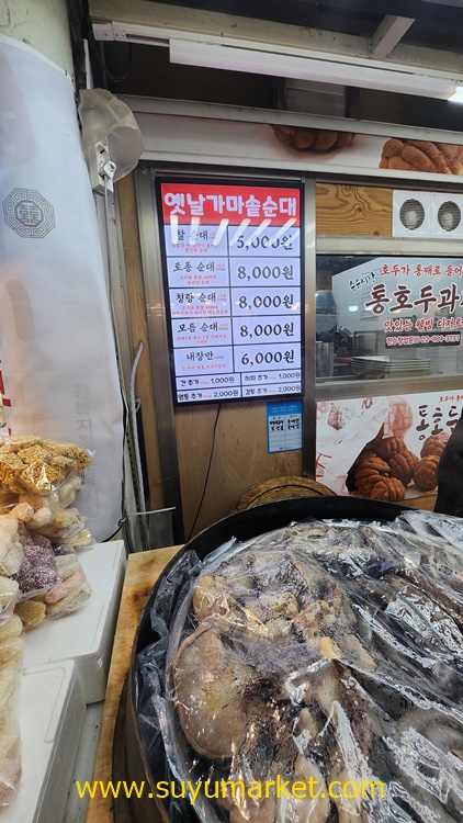 아이들이 통호두과자를 사달라고 졸라서 통호두과자를 사시고, 눈에 들어오는 깔끔한 가마솥순대를 어머님이 보고 그냥 넘어가지 못하시는 것같습니다.