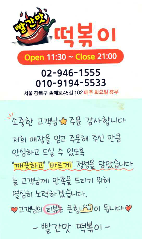 "수유전통시장"의 "남문1" 앞 20m전방에 위치한 빨간맛 떡복기