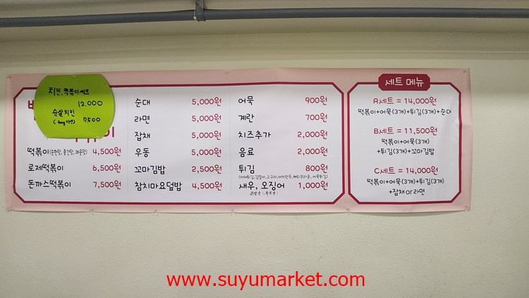 '수제튀김전문점'을 서브타이틀로 하고, 떡볶기, 오뎅, 순대, 꼬마깁밥, 잡채를 판매하고 있었고, 점포 디자인도 심플하면서 빨간색으로 강조하여서 산듯한 느낌의 신세대가 좋아할 것 같은 떡볶기집이이었습니다.