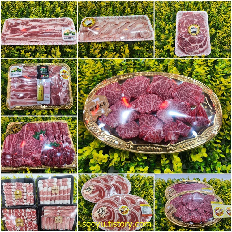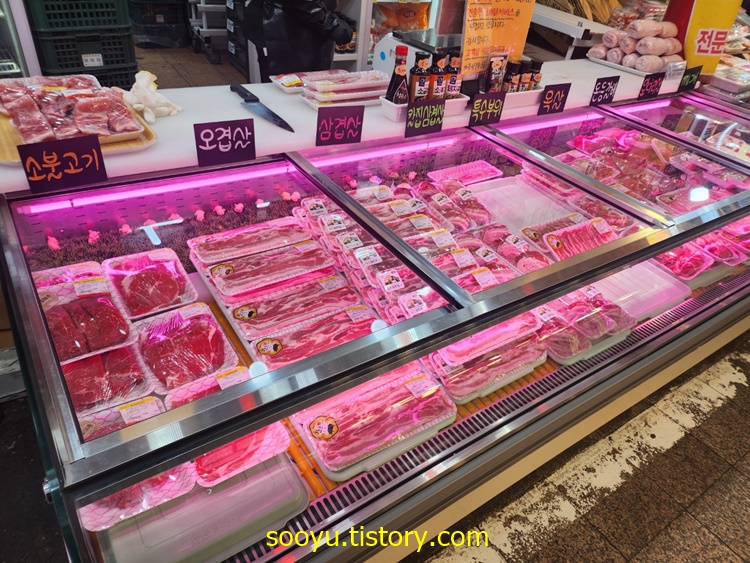 일단 홍보,행사 POP가 빼곡하고, 이는 정육 상품별 부위별 할인행사를 지속하고 있는 것을 알리고 있고, 진열장에 진열된 상품을 살펴보면 포장된 정육상품들도 각 잡고, 깔끔하게 정렬되어있음을 알 수 있습니다. 즉 "관리를 철저히 하고 있구나"를 알 수 있습니다.. 이의 결과로 고객입장을 들어보니 판매량이 많아서인지 정육의 육질이 고르게 좋고, 가격도 엄청 저렴하고, 대표에 대한 신뢰감이 있으므로 많은 분들이 다시 찾는다고 합니다. 즉, 고정단골고객층이 많음을 알 수 있습니다.