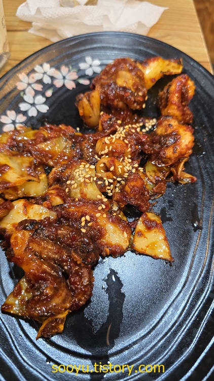 - 쭈꾸미볶음은 캡사이신 등의 인공 향미료를 넣지 않고, 진짜 불향을 입힌 천연재료로 맛을 낸 불향 쭈꾸미라고 합니다.