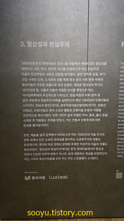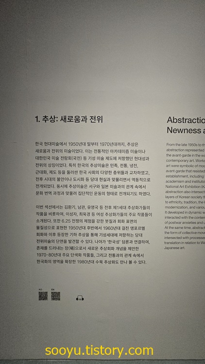 그간 조금 알고 있었던 시대별 유명작가분들의 다양한 작품을 보고, 한번에 이해하고 소화하기는 좀 어려운 것 같았지만, 그래도 대한민국의 대표작들을 시대별로 훑어 볼 수 있는 좋은 기회였던 것은 분명합니다. 특히 이미 알고 있던 거장분들의 단색화, 추상화는 친근하여서 왜 대한민국의 대표작이 되었는지 조금이나마 알 수 있었던 기회가 된 것 같습니다.