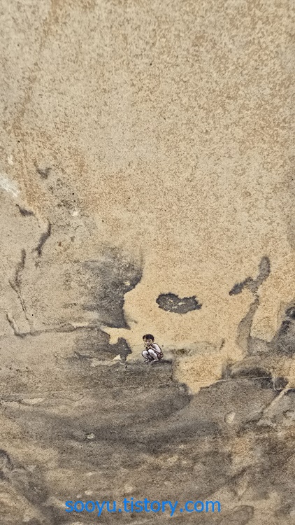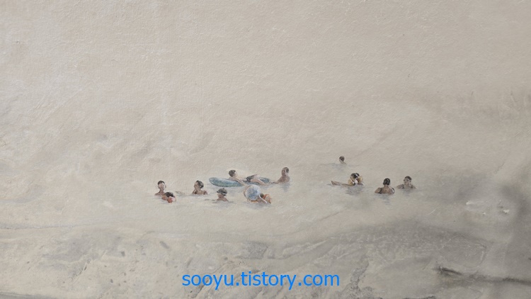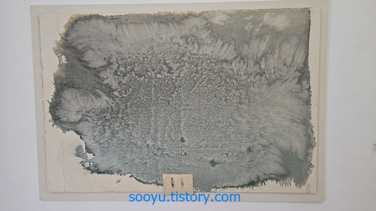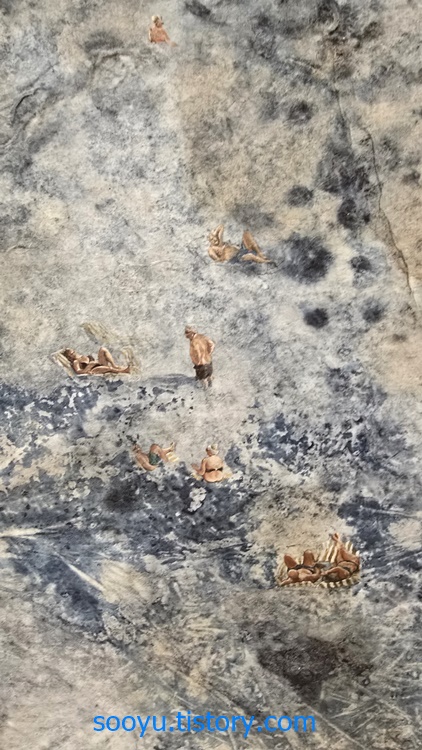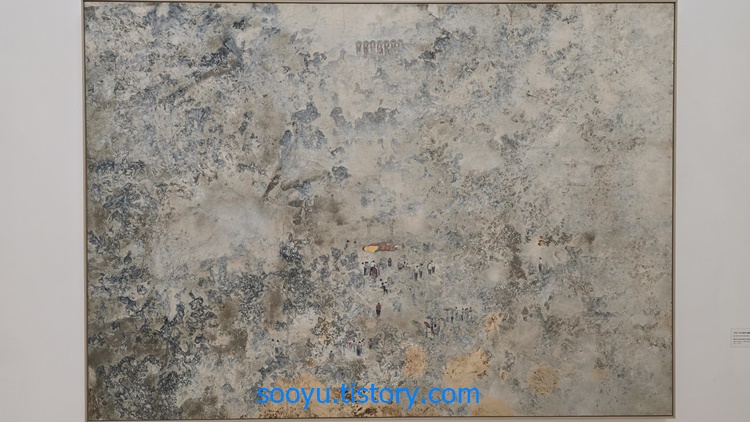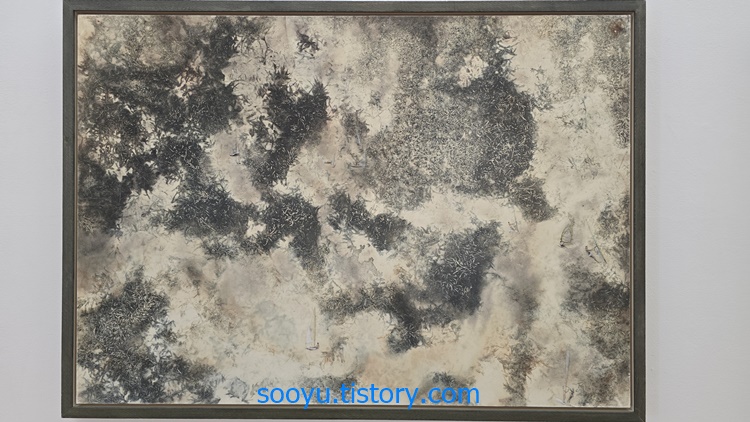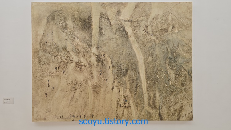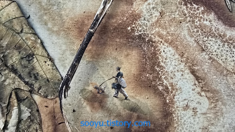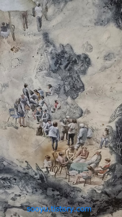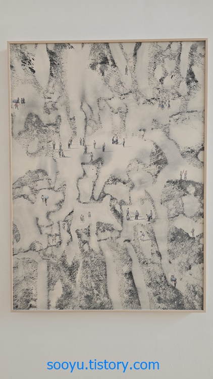 그러니까 동양화의 자연적으로 형성된 풍광 배경 그림 또는 확대된 자연 이미지에 작게 다양한 활동을 하는 인간들을 그려 넣음으로서 자연속에서 작가 자신이 만든 배경속에서 활동하는 인간들을 표현했습니다..