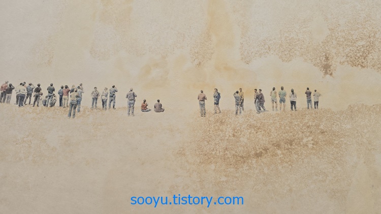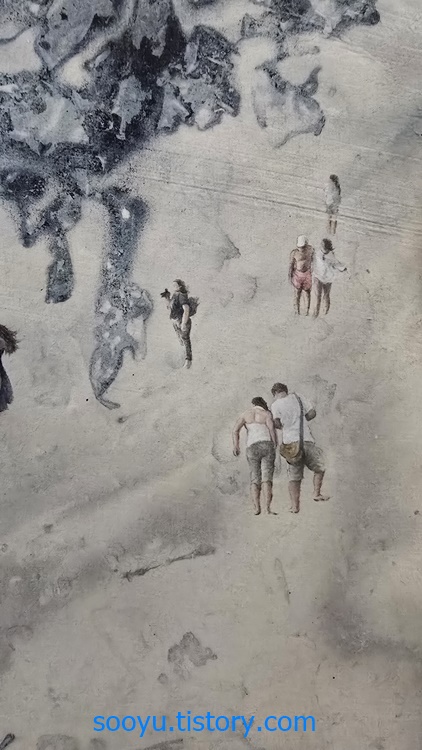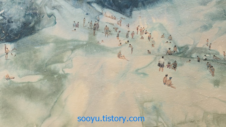 이를테면 거대한 자연속에 개미처럼 있는 축소된 인간군상들의 다양한 활동을 하는 모습...자연에 비해 인간은 보잘 것 없다 또는 자연에서 치유받는 인간 군상들이라는 메시지인지..우리들은 우리들이 자연이 준 알지 못하는 세상에서 깊이 생각하지 못하고 살고 있다는 메세지인 것처럼 느껴졌습니다.