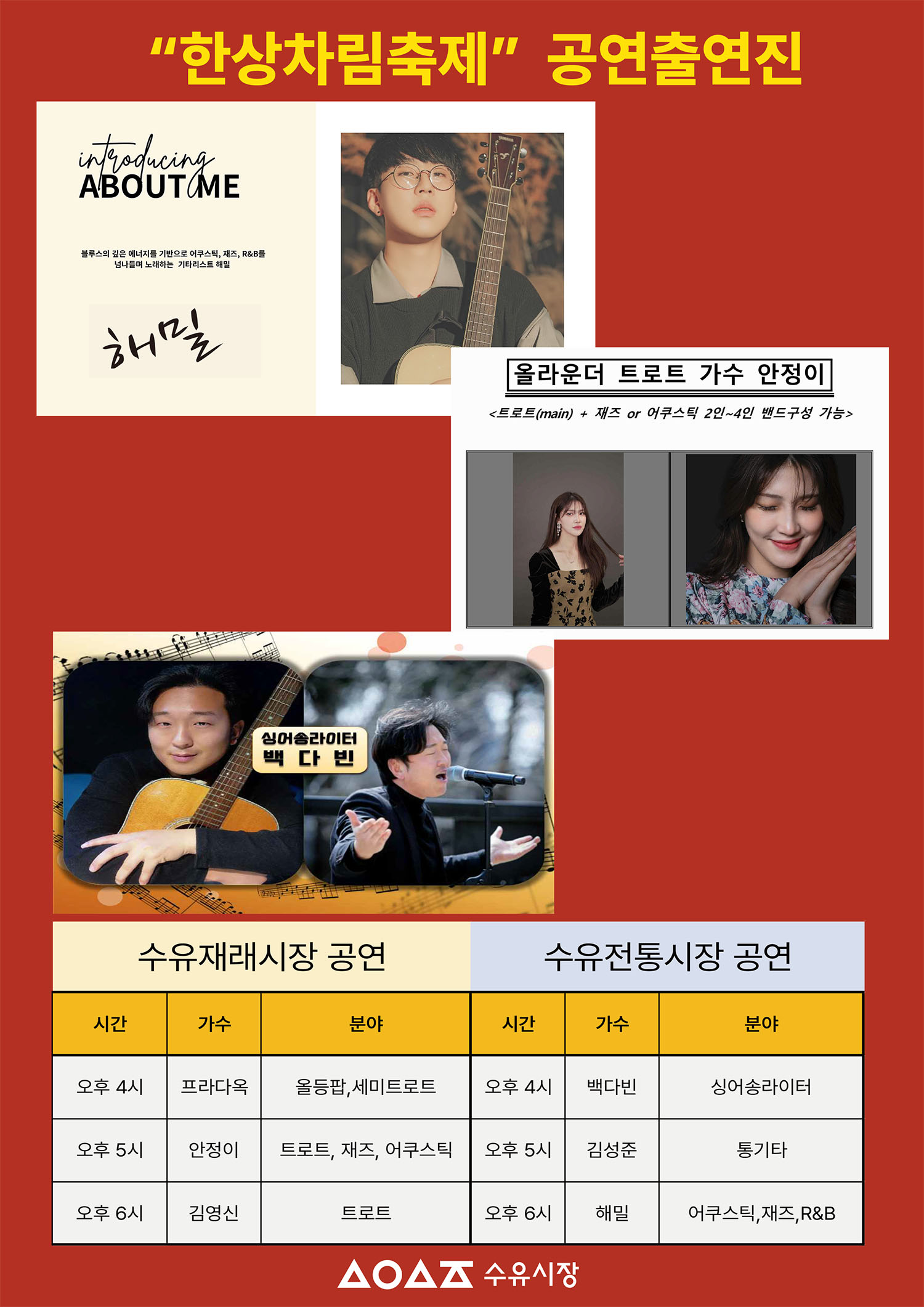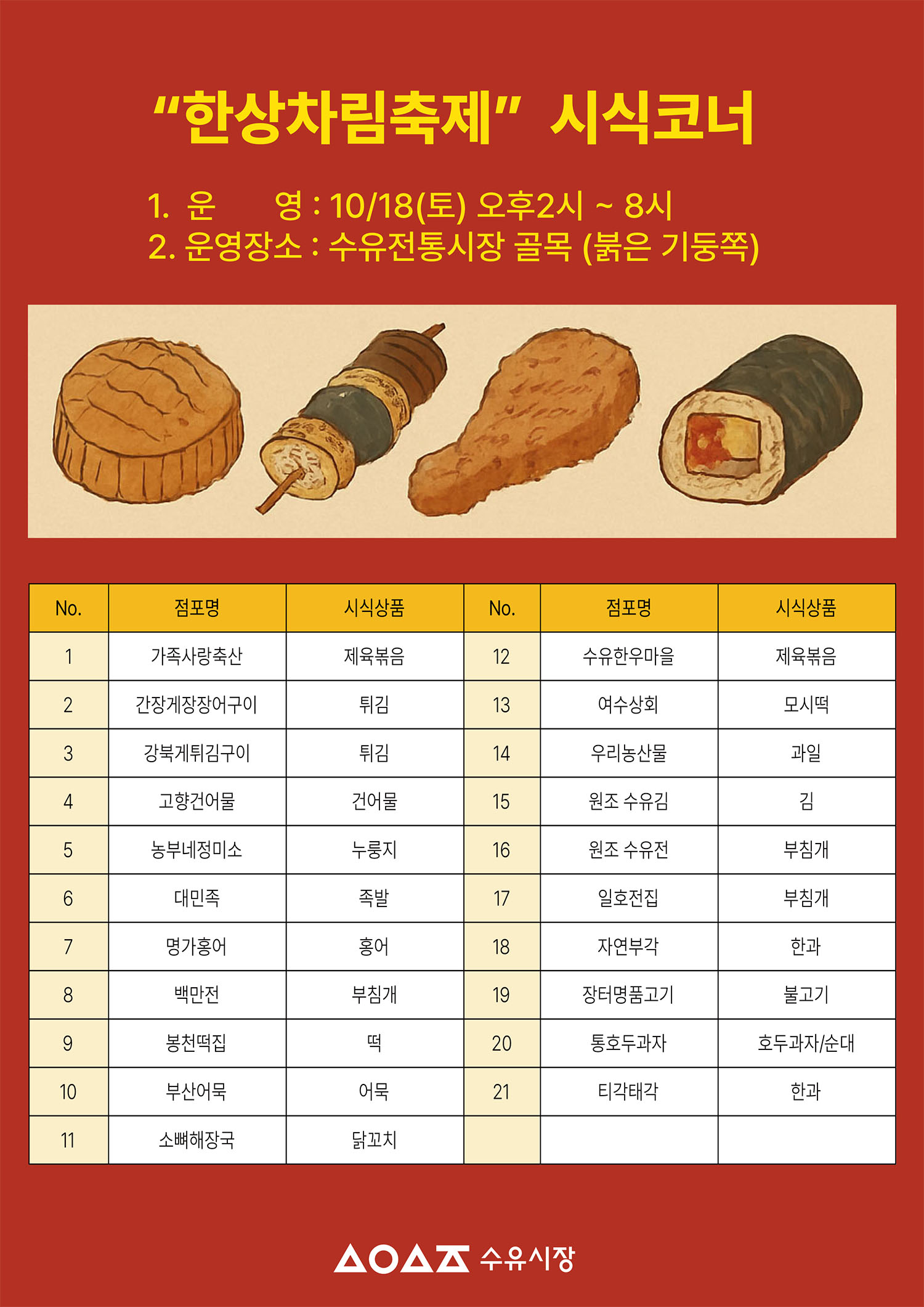 수유시장만의 다양한 먹거리와 다양한 공연 버스킹과 트롯트와 노래자랑을 생맥주와 함께 담아 가을의 추억을 만들고자 합니다.