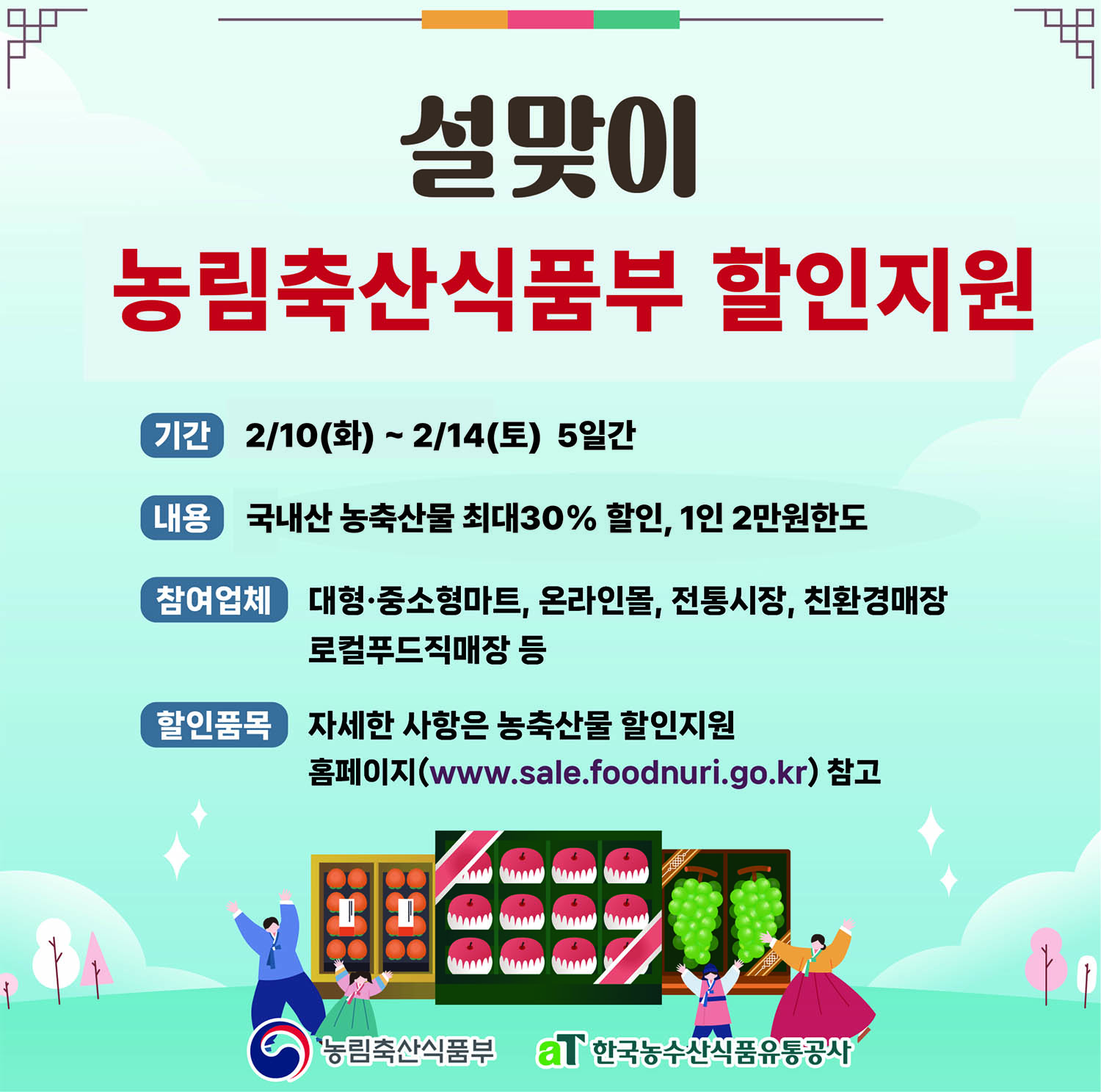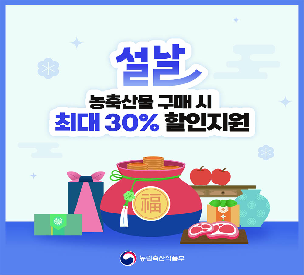 설 명절 국내산 농산물 및 축산물의 소비 활성화를 위해서 설 명절 성수기에 할인지원을 합니다.