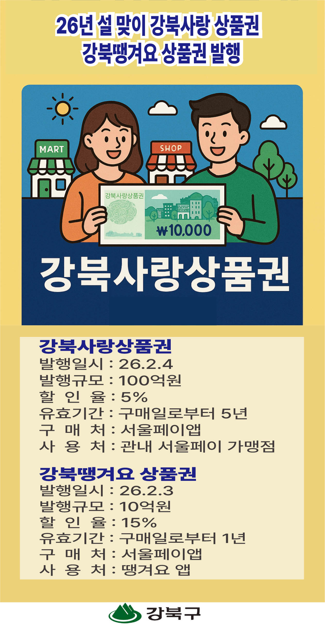 - 자치구 상품권: 2,823억 원 (해당 자치구 내 가맹점에서 사용 가능) 중 강북사랑 상품권 100억 원
