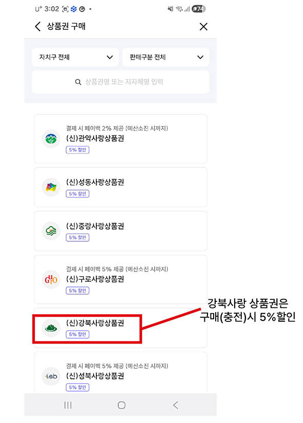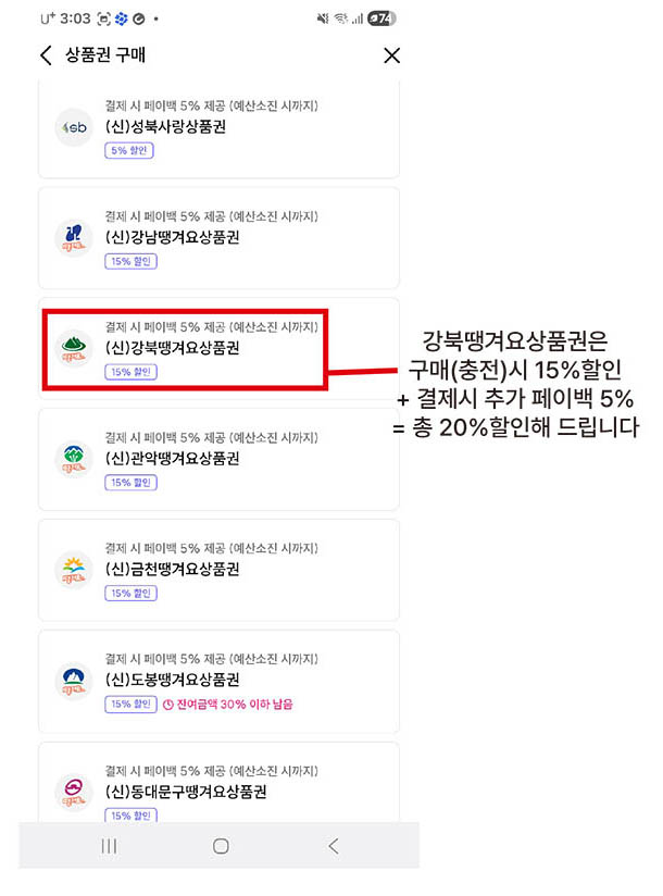 ※ 2월초 강북구에서는 아래와 같이 "강북사랑 상품권"과 "강북땡겨요 상품권"을 발행했습니다. 강북사랑 상품권은 오직 "서울Pay+"앱 에서만 구매하실 수 있습니다. 예산이 조기소진될 수 있으니 서두르세요!!
