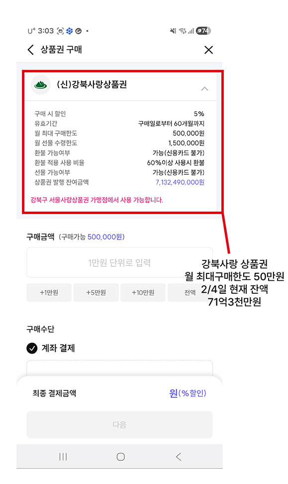 - 구매 한도: 강북사랑 상품권 - 월최대 구매한도 50만원 / 강북땡겨요 상품권 - 월최대 구매한도 20만원